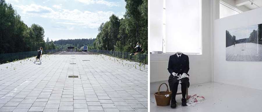 När jag för första gången för några år sedan såg bilder från Kymlinge tyckte jag mig känna igen platsen. Det visade sig att en av mina favoritutställare från Uppsala konstmuseum-tiden, HYUN-JIN KWAK hade med stationen i en av sina bilder i serien "Girls in Uniform". En fantastisk utställning som egentligen kräver sin egen post. Men mycket kortfattat bestod utställningen av stora fotografier med flickor i koreanska skoluniformer i iscensatta miljöer och kompositioner där frågor om uppväxt, kollektivet, öst som möter väst, flickor, mobbing, riter, tas upp. Ofta med kopplingar till koreanska traditionella myter och samtida skräckfilmer. Till bilderna hör även naturtrogna skulpturer av skolflickor i uniform, men utan huvuden. Det enda som skiljer dem åt är valet av skor - det enda som var möjligt att bestämma själv över i uniformen, vilket i sin tur blir viktiga val och markörer för individen. Dessa "dockor" är bland det läskigaste jag sett och jag var skräckslagen när jag skulle öppna de mörka utställningslokalerna själv.